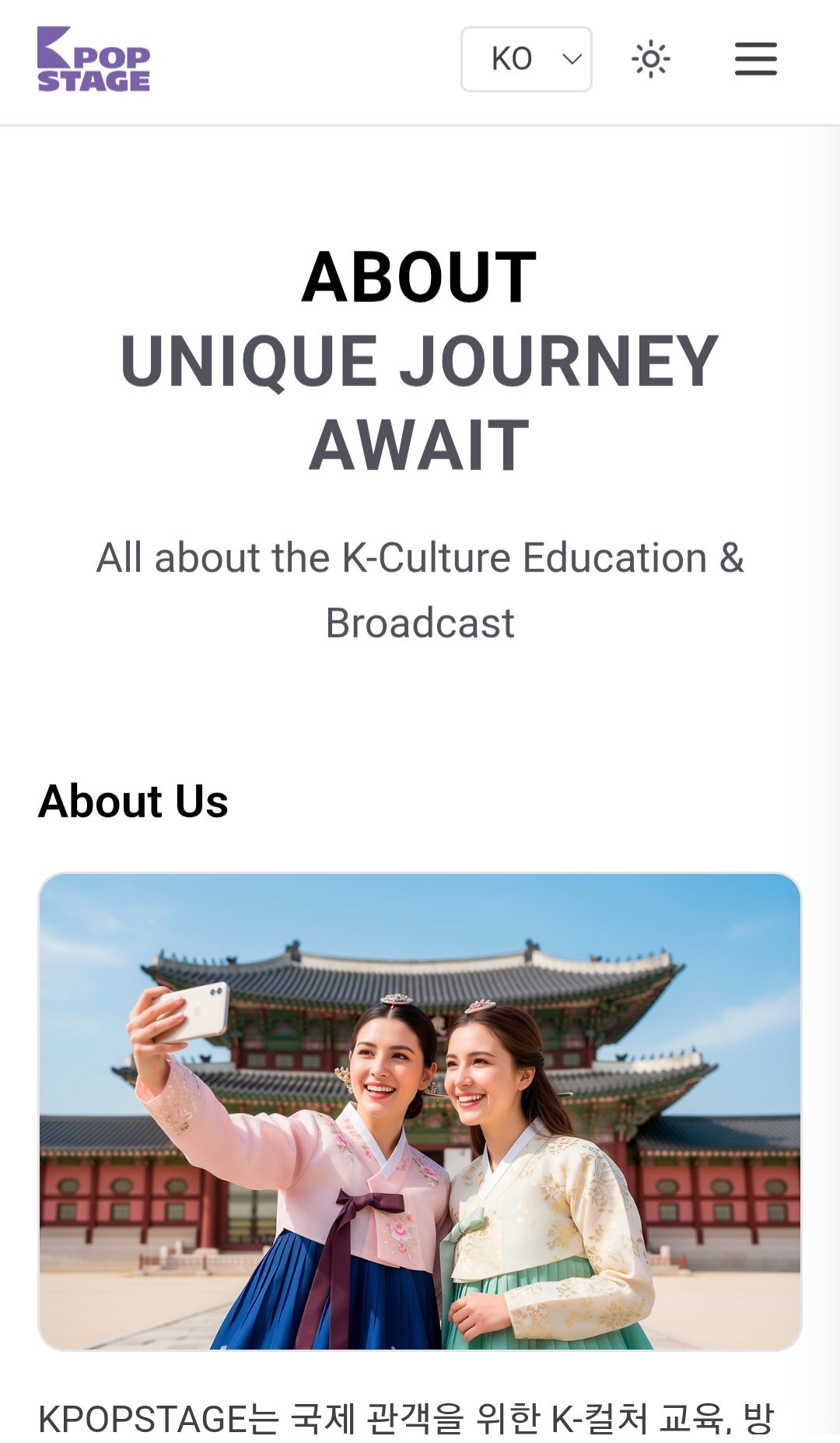 헤더 아래 "ABOUT", "UNIQUE JOURNEY AWAIT" 타이틀과 부제 "All about the K-Culture Education & Broadcast"가 있고, About Us 섹션에 한복을 입은 참가자들이 궁궐 배경에서 셀카를 찍는 대형 이미지가 배치되어 있습니다. 하단에 "KPOPSTAGE는 국제 관객을 위한 K-컬처 교육, 방..."으로 시작하는 설명 문단이 보이는 소개(About Us)·K-컬처 교육·방송 페이지입니다.
