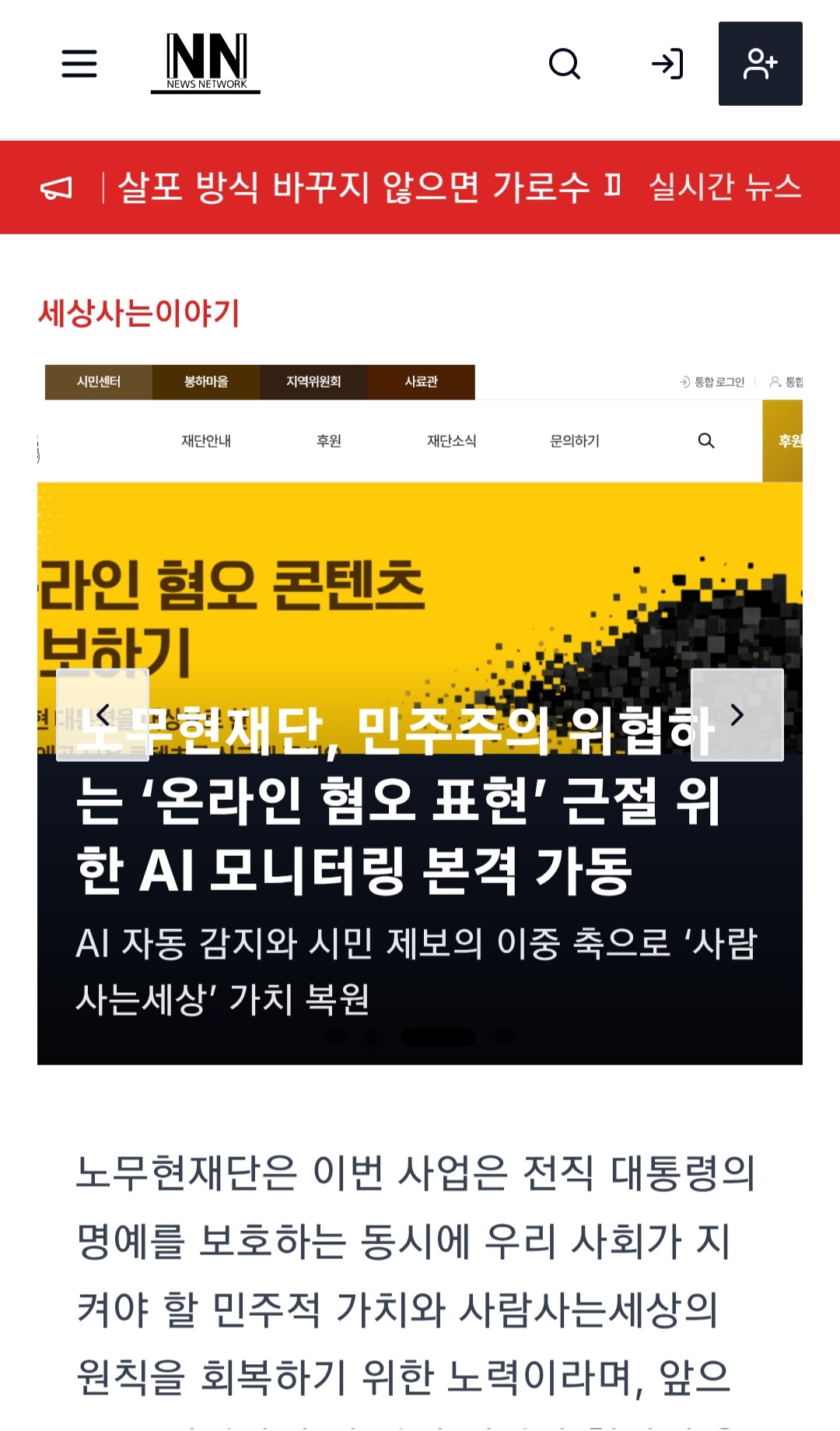 NN NEWS NETWORK 헤더와 실시간 뉴스 배너(빨간 배너) 아래, 「세상사는이야기」 섹션과 시민센터·봉하마을·지역위원회·사료관 등 상단 탭이 보입니다. 중앙에는 톱 기사를 강조하는 히어로 영역(노무현재단 AI 모니터링 관련 기사 제목·요약)이 배치되어 있고, 캐러셀 화살표로 여러 톱 기사를 넘길 수 있습니다. 바로 아래 본문 시작 부분이 이어지는 구조입니다.